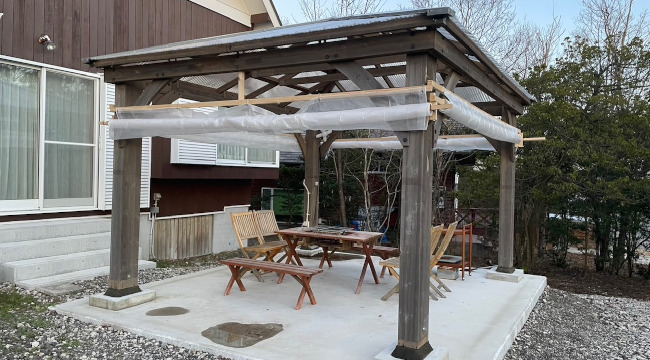 屋外設備 | 雨天対応専用バーベキュー場 (防寒用風除けシート・夜間照明付) ※バーベキューは22時まで。 |